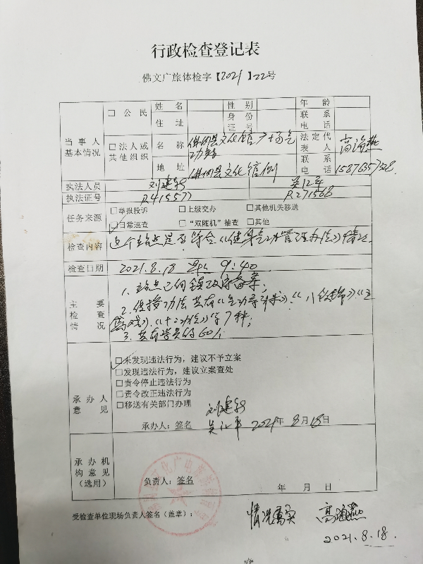 2021年8月18日,佛冈县文化广电旅游体育局根据“双随机、一公开”精神,对佛冈县文化馆广场气功站进行了行政检查。