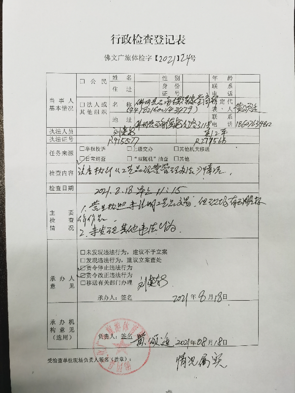 2021年8月18日,佛冈县文化广电旅游体育局根据“双随机、一公开”精神,对佛冈县石角镇得缘堂商行进行了行政检查。