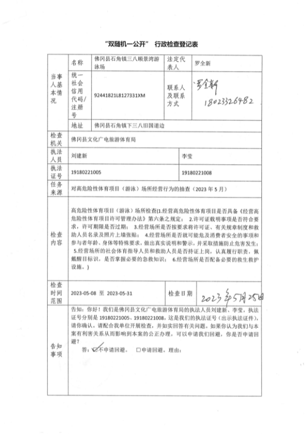 2023年5月25日,佛冈县文化广电旅游体育局根据“双随机、一公开”精神,对清献崔公祠、佛冈县石角镇三八顺景湾游泳场进行了行政检查。