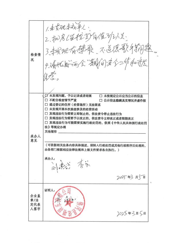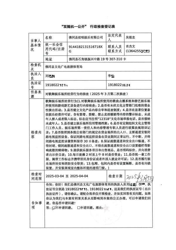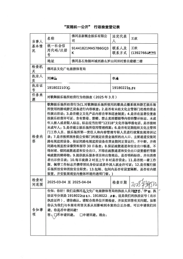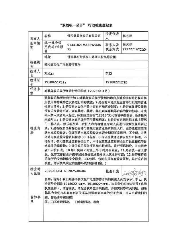 一、佛冈紫晶宫娱乐有限公司检查情况
