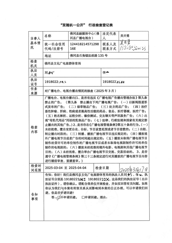 | 名称: | 佛冈县文化广电旅游体育局2025年3月“双随机、一公开”抽查结果公示 | ||