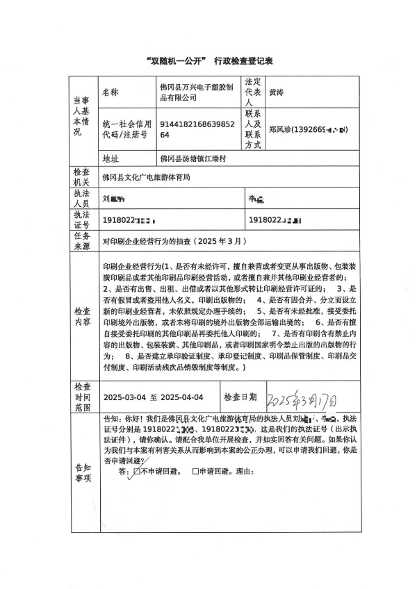 五、佛冈县万兴电子塑胶制品有限公司检查情况