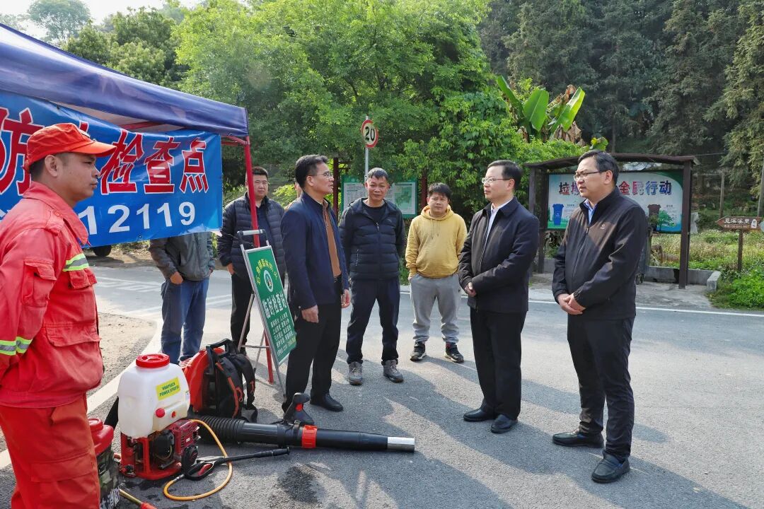 江红平一行先后来到石角镇莲溪村城北幼儿园旁森林防火检查点,实地查看森林防火点设卡情况,详细了解清明期间镇村进山路口火源管控、排查登记和值班值守等管控措施落实情况。