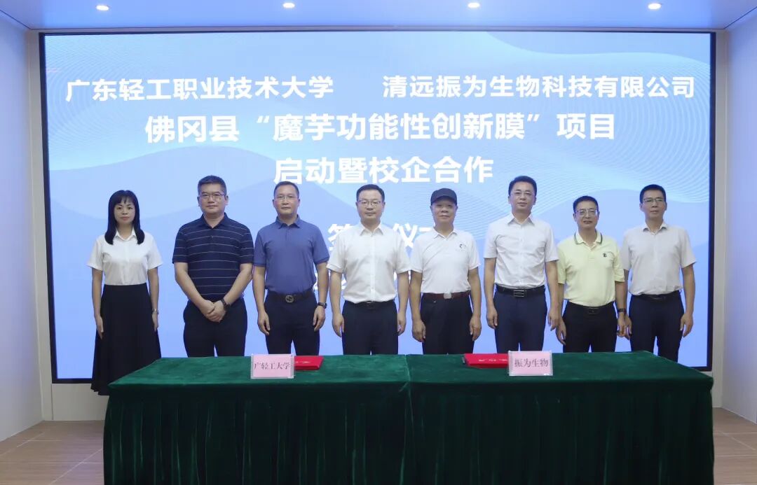 在政校企三方的共同见证下,广东轻工职业技术大学与清远振为生物科技有限公司签订了“魔芋功能性创新膜”项目合作协议书。