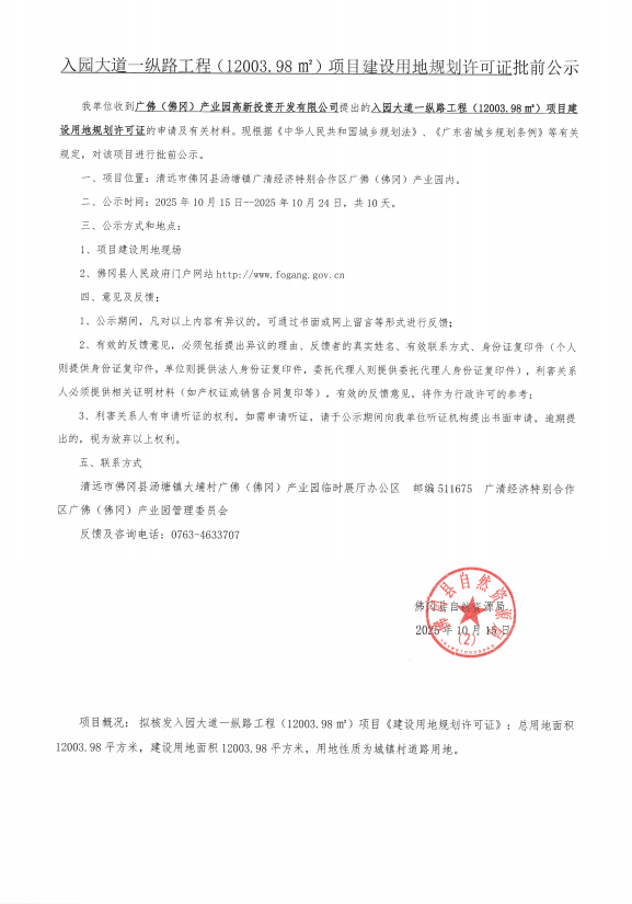 入园大道一纵路工程(12003.98㎡ )项目建设用地规划许可证批前公示