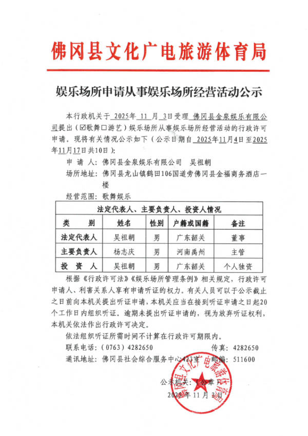 本行政机关于 2025年 11 月 3日受理 佛冈县金泉娱乐有限公司提出(☑歌舞□游艺)娱乐场所从事娱乐场所经营活动的行政许可申请。现将有关情况公示如下(公示日期自 2025年11月4日至2025年11月17日共10日):