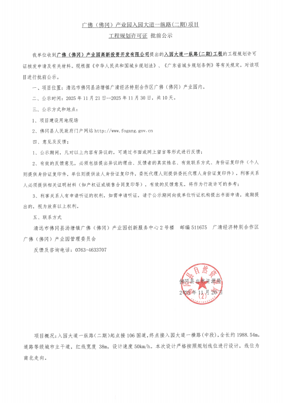 广佛(佛冈)产业园入园大道一纵路(二期)项目工程规划许可证批前公示