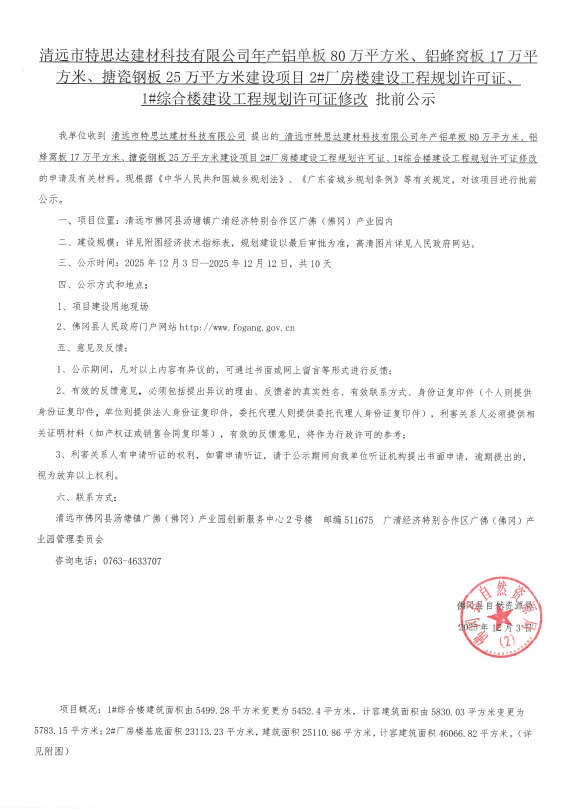 清远市特思达建材科技有限公司年产铝单板80万平方米、铝蜂窝板17万平方米、搪瓷钢板25万平方米建设项目2#厂房楼建设工程规划许可证、1#综合楼建设工程规划许可证修改批前公示