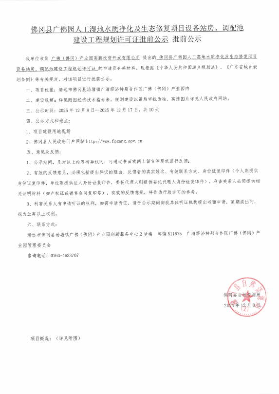 佛冈县广佛园人工湿地水质净化及生态修复项目设备站房、调配池建设工程规划许可证批前公示