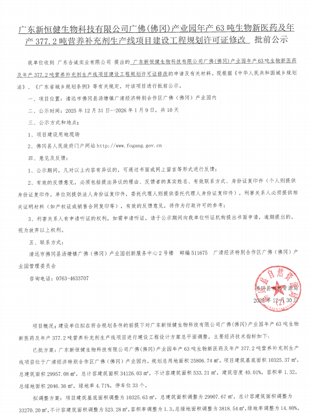 广东新恒健生物科技有限公司广佛(佛冈)产业园年产63吨生物新医药及年产377.2吨营养补充剂生产线项目建设工程规划许可证修改批前公示