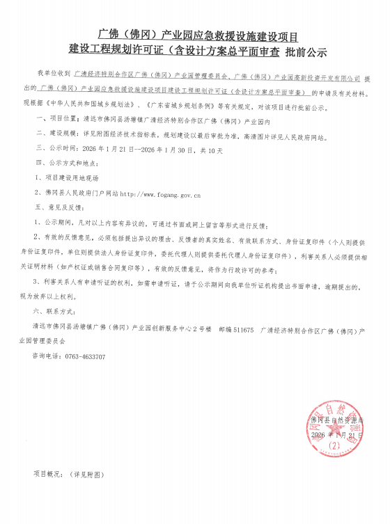 广佛(佛冈)产业园应急救援设施建设项目建设工程规划许可证(含设计方案总平面审查)批前公示