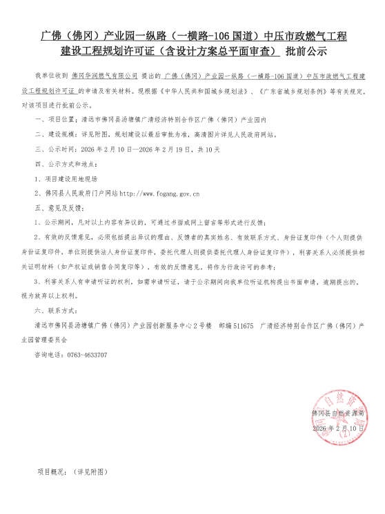 广佛(佛冈)产业园一纵路(一横路-106国道)中压市政燃气工程建设工程规划许可证(含设计方案总平面审查)批前公示