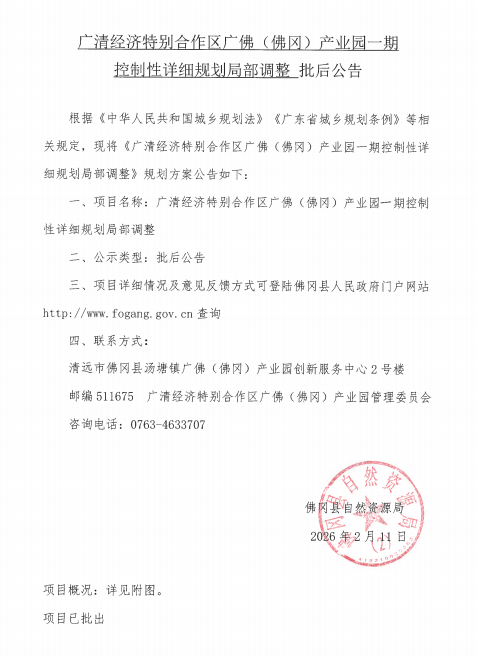 广清经济特别合作区广佛(佛冈)产业园一期控制性详细规划局部调整批后公告