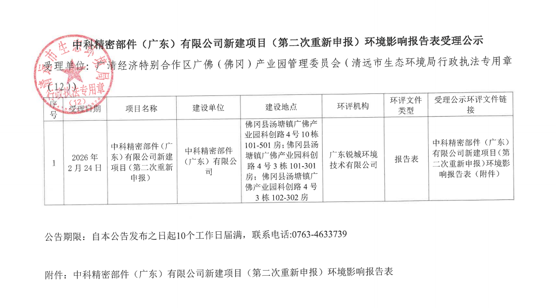 中科精密部件(广东)有限公司新建项目(第二次重新申报)环境影响报告表受理公示