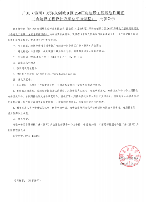广东(佛冈)万洋众创城D区26#厂房建设工程规划许可证(含建设工程设计方案总平面调整)批前公示