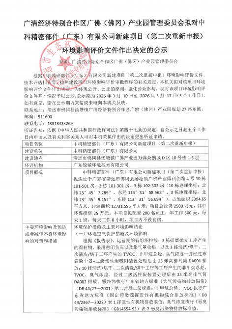 广清经济特别合作区广佛(佛冈)产业园管理委员会拟对中科精密部件(广东)有限公司新建项目(第二次重新申报)环境影响评价文件作出决定的公示