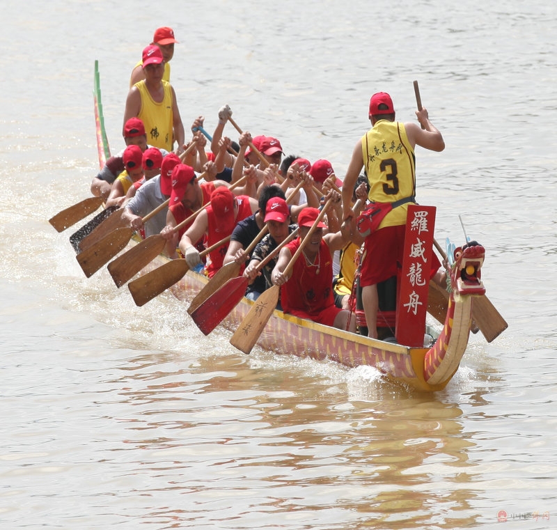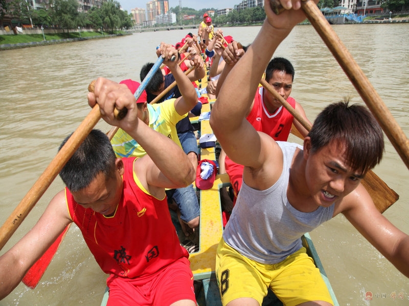 5月31日上午,记者赶到他们的训练现场。未见其舟,先闻其声,雄壮的吆喝声夹杂着轰鸣的鼓声,于潖江河两岸回荡。来到湖滨桥头,周围已经聚集了上百名围观的群众,最兴奋的就是孩子们了。河面上,一叶轻舟在高速穿行,随着强劲有节奏的鼓点,威武的龙舟像离弦之箭奔向前方。
