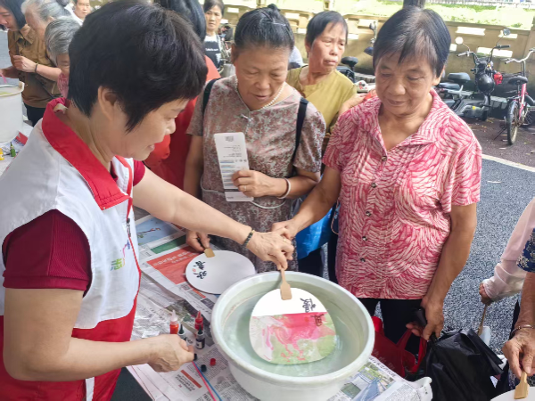 在非遗漆扇制作体验区,工作人员首先为在场的长者们娓娓道来漆扇的历史渊源——从古代文人雅士的随身之物到如今的非遗瑰宝,细致解读其背后承载的文化价值。讲解过后,工作人员拿起颜料与扇面,一步步示范调色、施色、晕染等关键技法,动作娴熟而耐心。看着精美的示范样品,长者们早已跃跃欲试,随即纷纷拿起工具投入创作,现场满是专注的神情与交流的笑意,热情在笔墨色彩间悄然流淌。