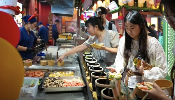 玩:换上唐装漫步青瓦红墙间,打卡非遗手作摊位,参与篝火晚会集体祈福,感受长安不夜城盛景。