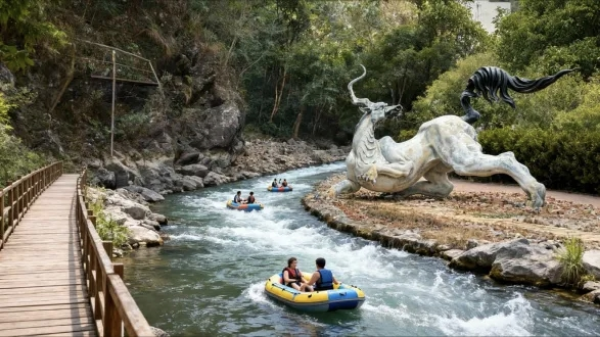此次升级建设的羊角山大峡谷漂流项目,深度结合佛冈文旅发展规划,以《山海经》中的“山经”篇章与祥瑞神兽文化为核心定位,构建“漂流+”多元业态体系,延伸打造文化观光、亲子互动、休闲度假等配套业态,实现生态资源与传统文化的有机融合。