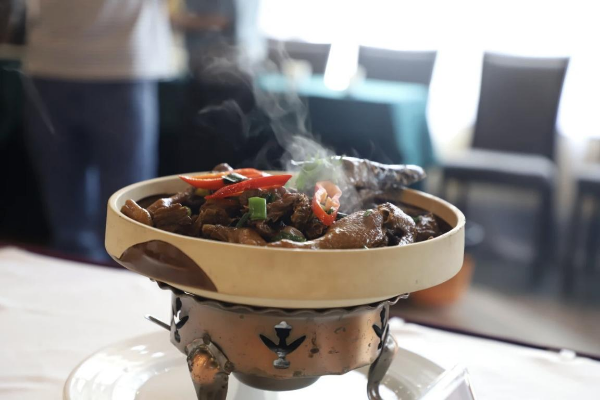 还有龙山碌鹅,本地散养乌鬃鹅配秘制酱料慢焖,肉质紧实甘香;芋头蒸鹅鹅肉鲜香、芋头粉糯吸汁,风味更足;水头烧肉现烤现切,外皮酥脆、内里多汁;鲜嫩弹牙的四九牛肉、皮脆肉嫩的农家烧鸡、鲜甜爽滑的本地清蒸鲩鱼。