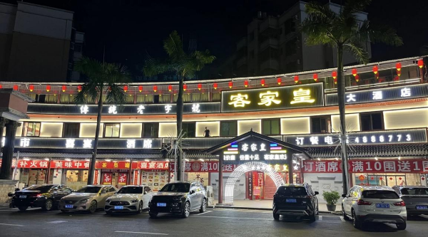 佛冈客家皇大酒店拥有大型停车广场(可停10辆旅游大巴),地理位置优越。设有早茶、中餐、各大喜宴酒席,开店17年,以菜香饭热、份量十足赢得广大客户的信任和支持,并在2017年香港美食之旅,评为“金奖”;2018年网红人气美食评为“金奖”;2023年佛冈一桌菜“客家焾肉”评为“金奖菜”而本酒店评为“银牌餐饮店”。