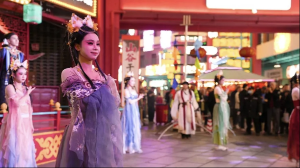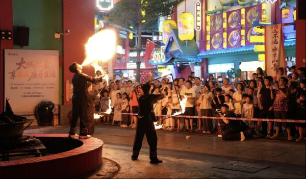 玩:换上唐装漫步青瓦红墙间,打卡非遗手作摊位,参与篝火晚会集体祈福,感受长安不夜城盛景。