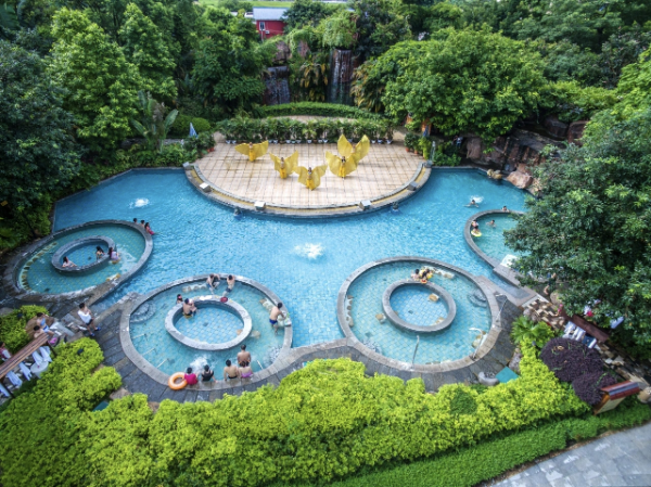 2.聚龙湾天然温泉度假村:老牌4A景区,露天温泉池错落林间,氡泉养生价值高,配套水世界、KTV、拓展设施,性价比拉满,适合家庭与团体出游。