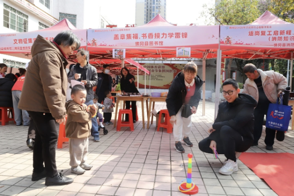 演出结束后,各摊位活动正式开启。县图书馆推出的“盖章+趣味游戏”特色活动,吸引了大批群众驻足参与,成为集市中一处亮丽的文化打卡点。