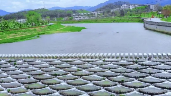鱼鳞坝位于新坣村的茶园桥下,错落有致的“鱼鳞片”分布在河坝,清澈的河水漫过“鳞片”带来“唰唰”的流水声,形成了秀美的水域风景长廊。