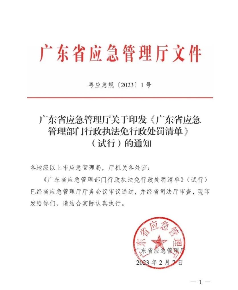 《广东省应急管理部门行政执法免行政处罚清单(试行)》已经省应急管理厅厅务会议审议通过,并经省司法厅审查,现印发给你们,请结合实际认真执行。